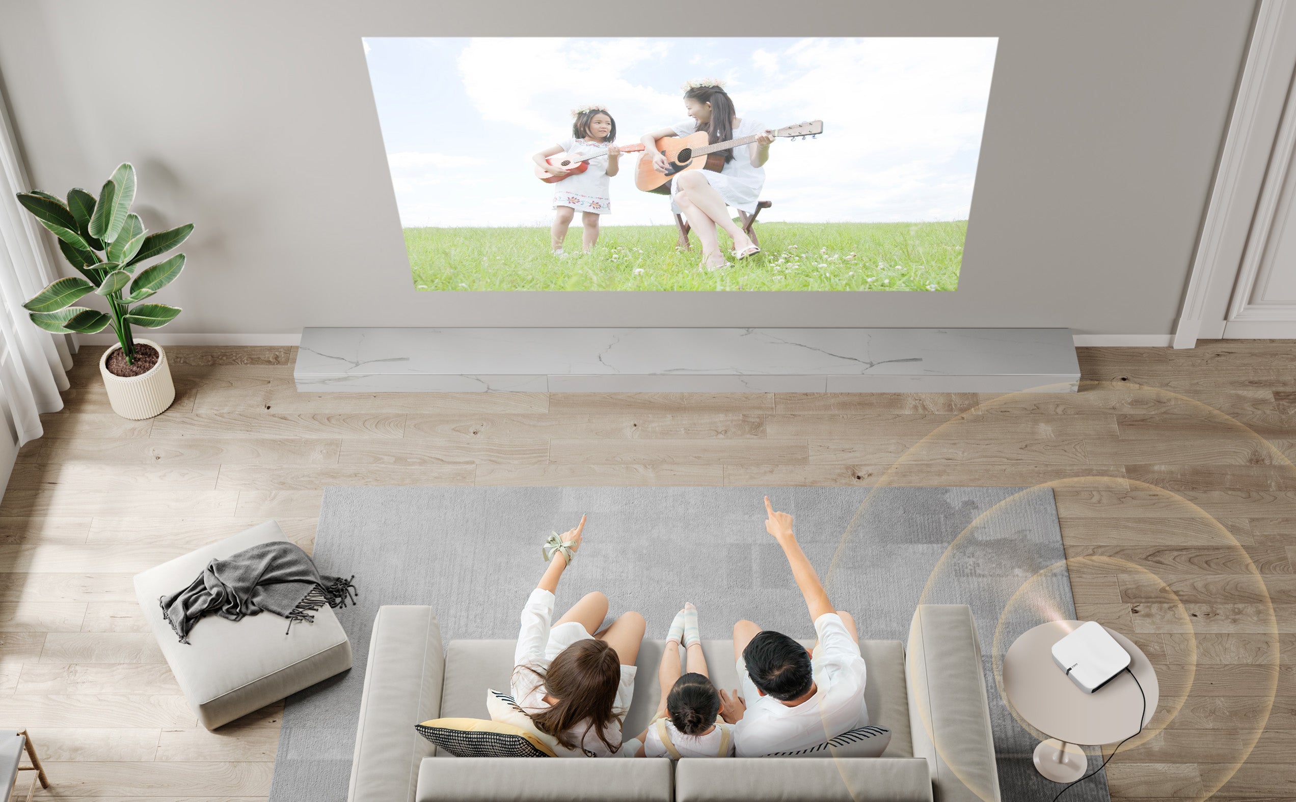 最大200インチ1のフルHD映像を大画面で楽しむことができるElfin。便利な自動画面調整機能により、家族みんながカンタンに高画質·高音質の映像体験をお楽しみいただけます。
