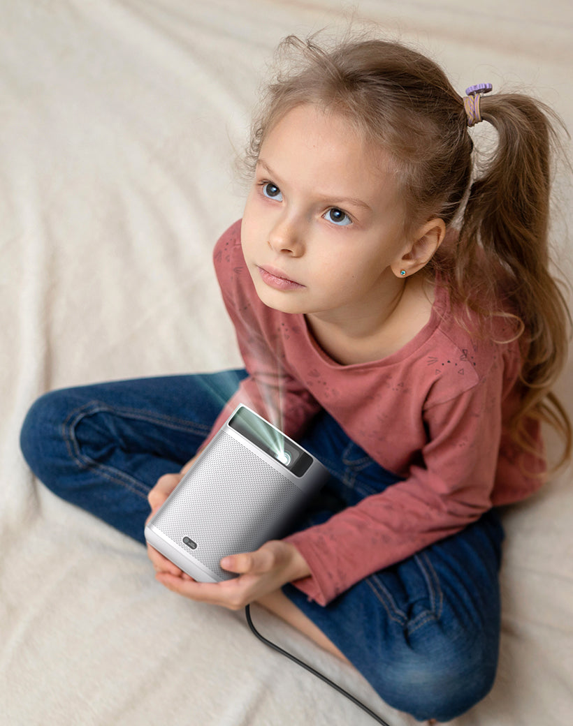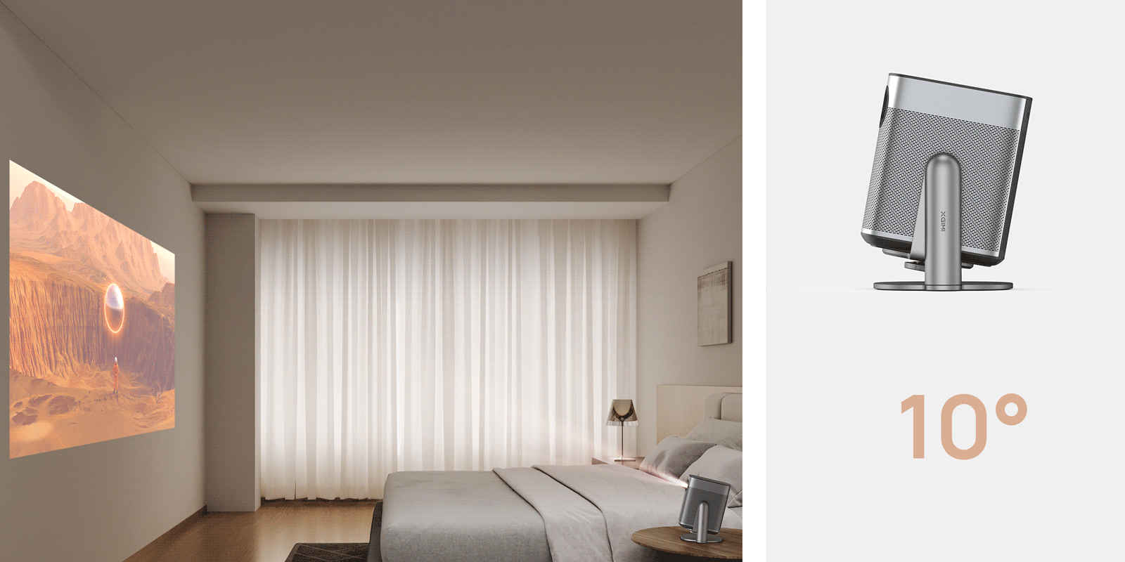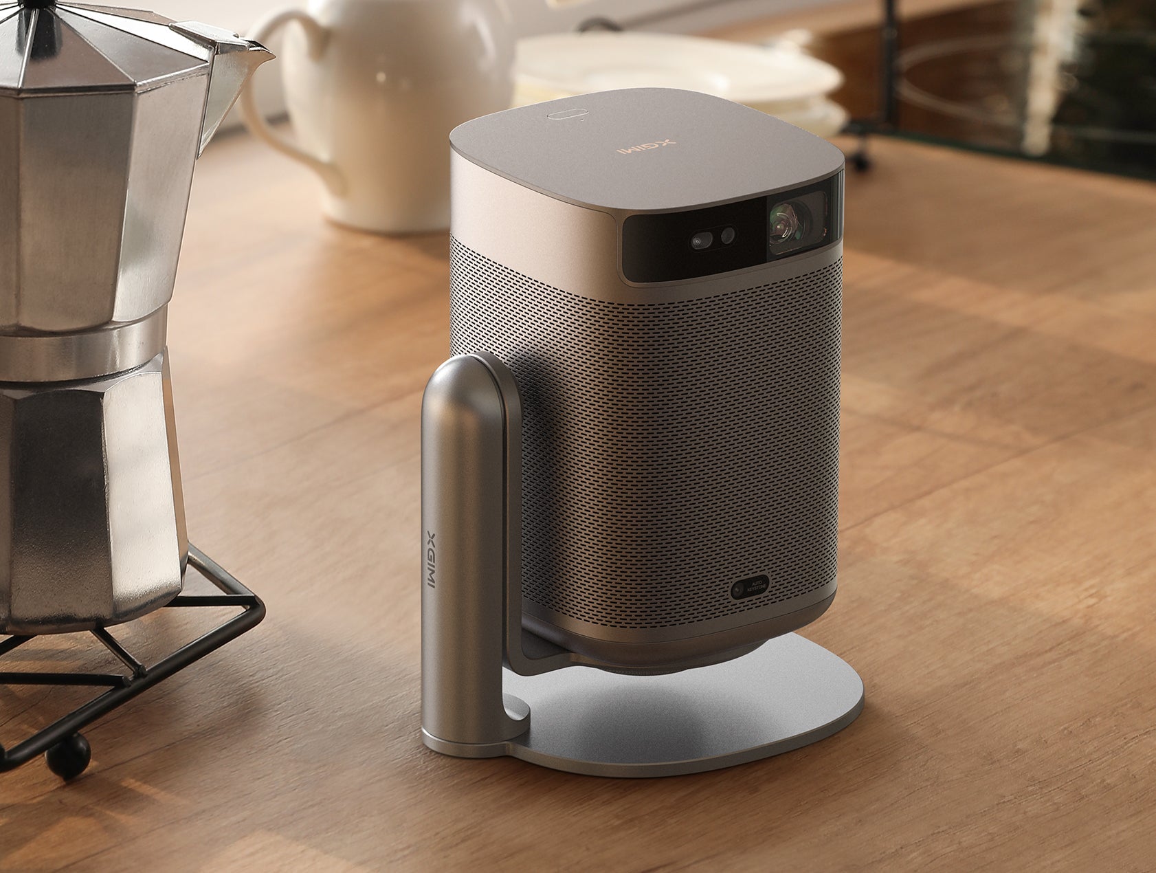 マルチアングル スタンドとプロジェクターの組み合わせは、コーヒーポットくらいの、手で持ちやすいサイズです。