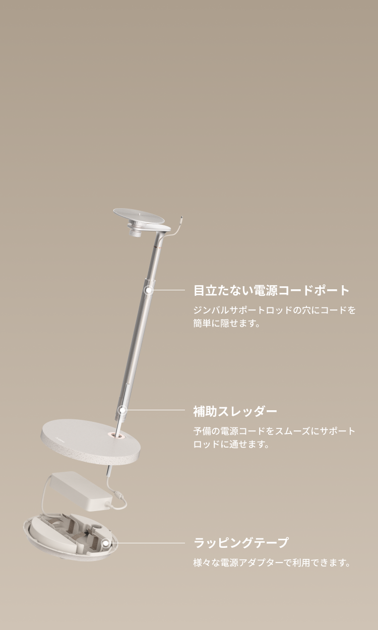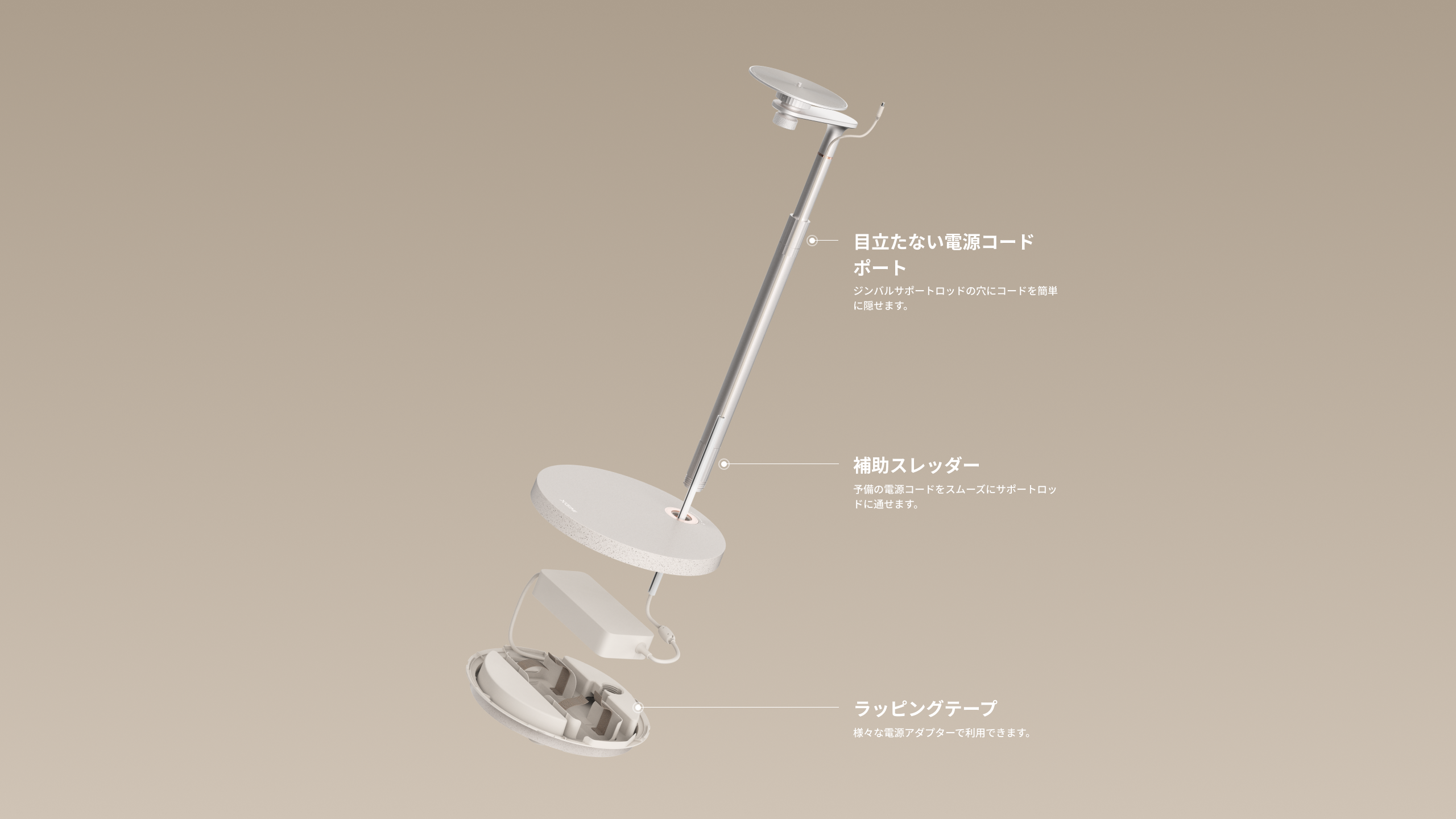 - 隠し収納ですっきりとした外観: 電源アダプタとケーブルは、独自の収納が付いており、全体がすっきりとした外観に。ジンバルサポートロッド内は空洞で、内部にコードを収納できます。