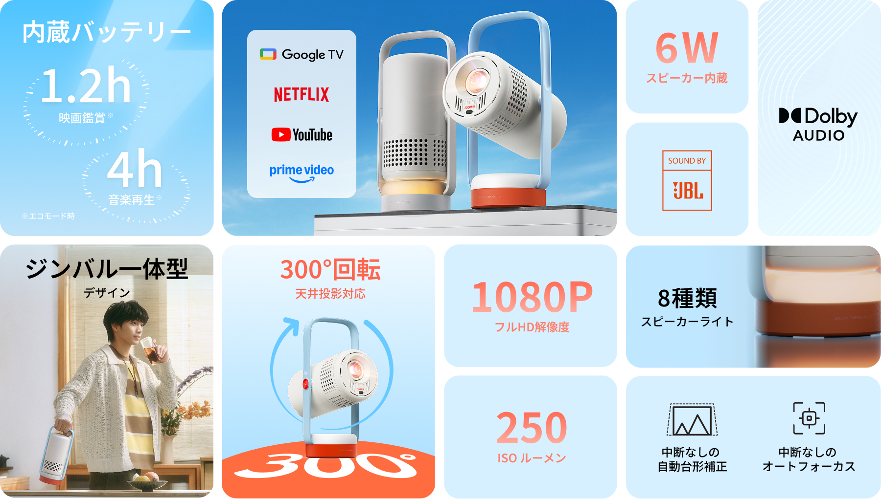 - 一台で多機能、映像も音楽も楽しめる:プロジェクターであるだけでなく、6WのSound by JBLポータブルスピーカーとしても活躍。スピーカーライトと組み合わせることで、臨場感溢れる視聴空間を簡単に演出できます。