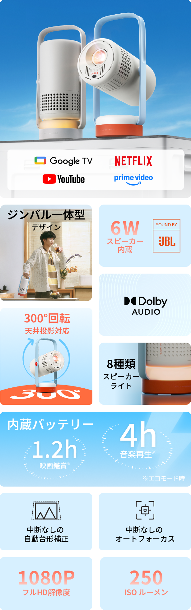 - 300°回転ジンバル:内蔵された300°自由回転のジンバルにより、片手で軽く回すだけで投影方向を瞬時に切り替え、天井シアターを手軽に実現。さらに、ジンバルはそのまま持ち手としても使え、外出時の持ち運びも便利です。